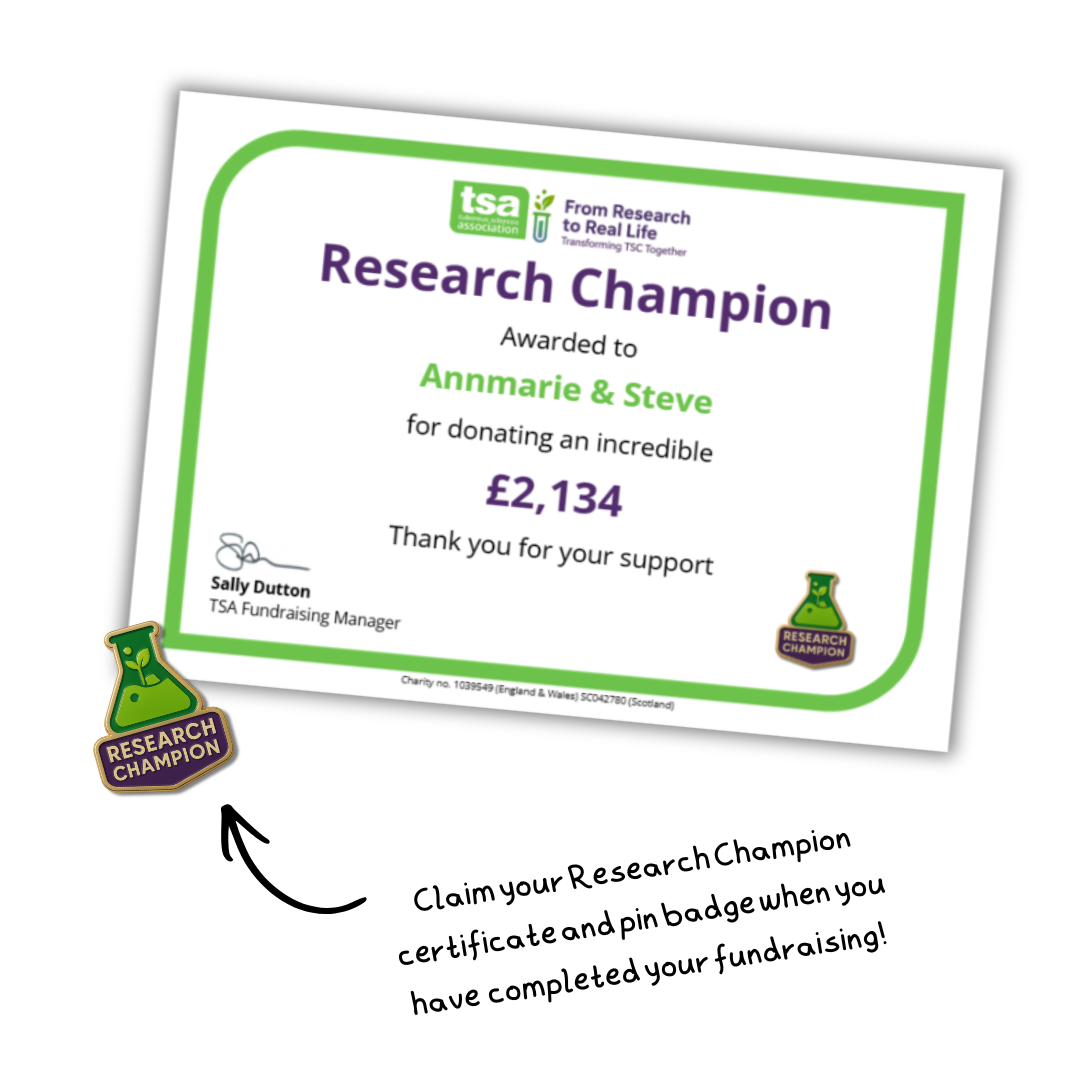 By becoming a Research Champion you will be raising funds that can secure the future of research campaigns for the TSA. 100% of every donation made towards your fundraising activity will go directly towards the aims of our Research Strategy.